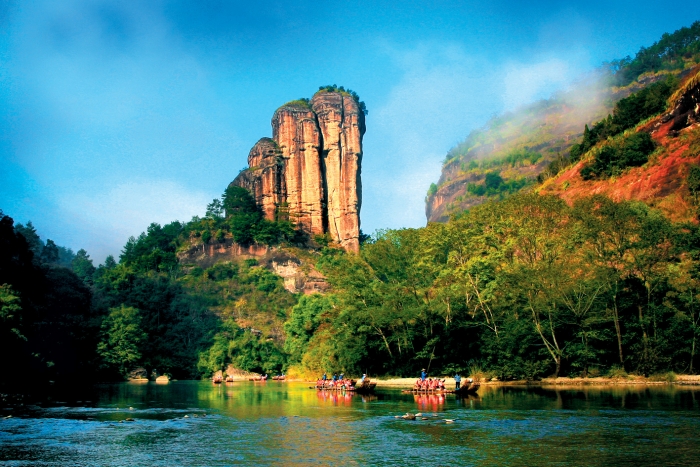 作为世界文化与自然“双遗产”地,福建省武夷山市始终把生态环境保护作为立市之本、立业之基,生态文明理念已经深深根植在这里的碧水丹山之中。好的生态效益带来的是实实在在的经济效益,近年来,该市以旅游业为引领的第三产业快速发展。图为游客在玉女峰前的九曲溪中乘竹筏漂流。郑友裕 摄